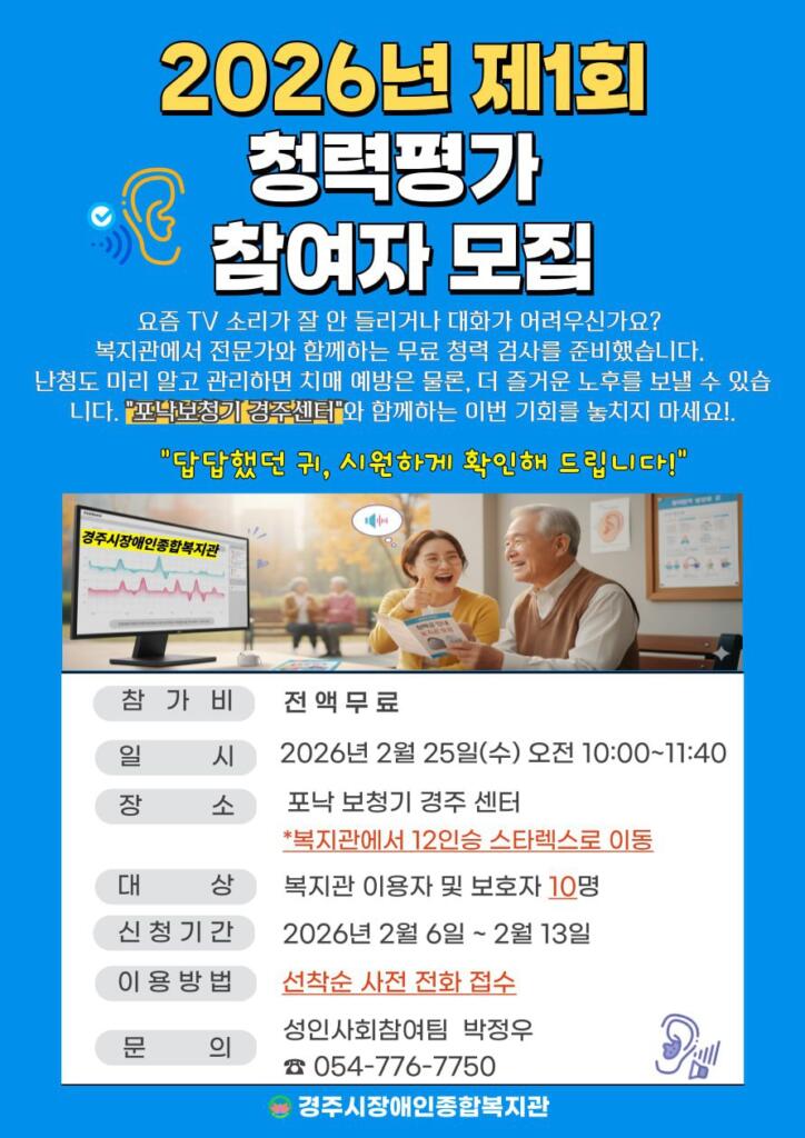 홈복지관소식공지사항공지사항 공지사항 [공지] 2026년 제1회 청력평가 참여자 모집 (선착순 전화 접수) 작성자 Admin 작성일 2026-02-05 11:32 조회 97 좋아요 0 싫어요 0 인쇄 « [공지] 2026년 설 명절 맞이 이벤트 "삶 공감으로 잇는 동행마켓" [공지] '붉은 말의 힘찬 기운, 모두 함께 즐거운 설날 이벤트' 행사 안내 » 목록보기 Powered by KBoard