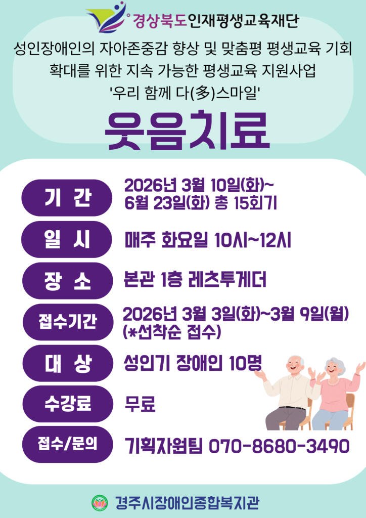 홈복지관소식공지사항공지사항 공지사항 [공지] 경상북도인재평생교육재단 평생교육 특성화 지원사업 '우리 함께 다(多) 스마일' 웃음치료 참여자 모집 작성자 Admin 작성일 2026-03-06 14:55 조회 2929 인쇄 « [공지] 한눈에 보는 주요행사 일정표(2026년 3월) [공지] 2026년 봄 맞이 이벤트 ' 삶 공감으로 잇는 찾아가는 감성마켓' » 목록보기 답글쓰기 Powered by KBoard