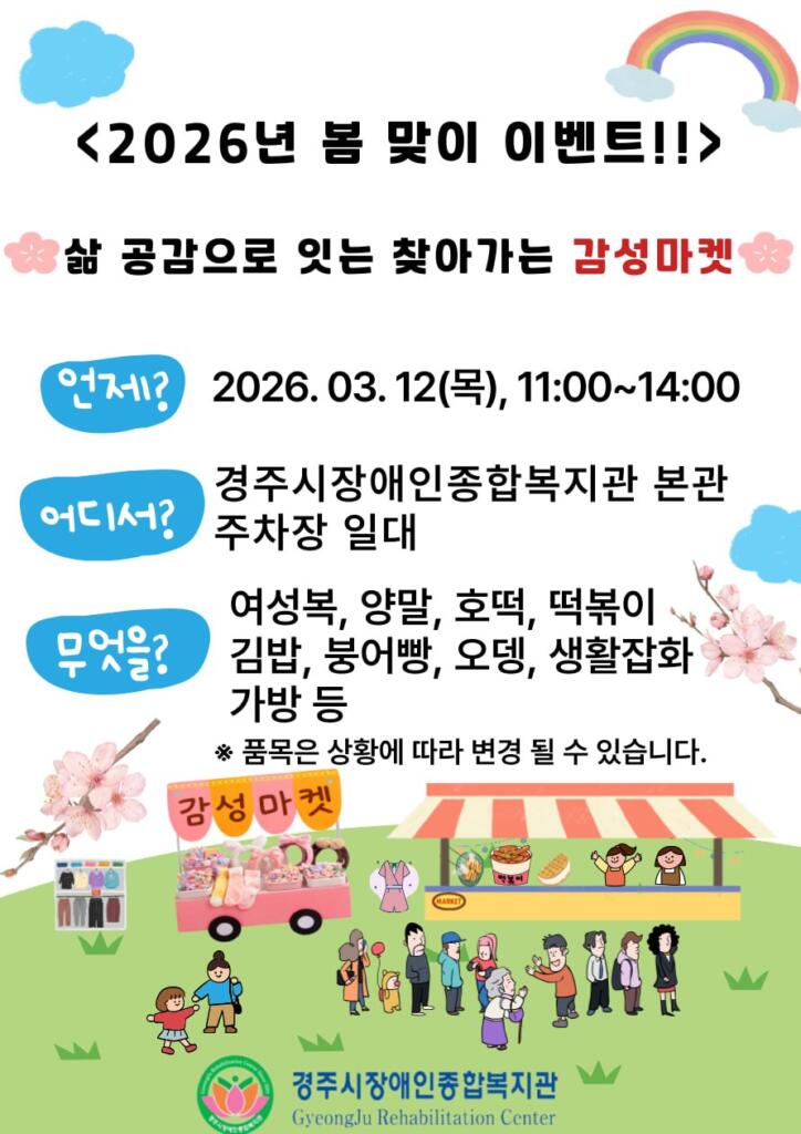 홈복지관소식공지사항공지사항 공지사항 [공지] 2026년 봄 맞이 이벤트 ' 삶 공감으로 잇는 찾아가는 감성마켓' 작성자 Admin 작성일 2026-03-09 16:34 조회 1396 인쇄 « [공지] 경상북도인재평생교육재단 평생교육 특성화 지원사업 '우리 함께 다(多) 스마일' 웃음치료 참여자 모집 [공지] 한방진료 안내 » 목록보기 답글쓰기 Powered by KBoard