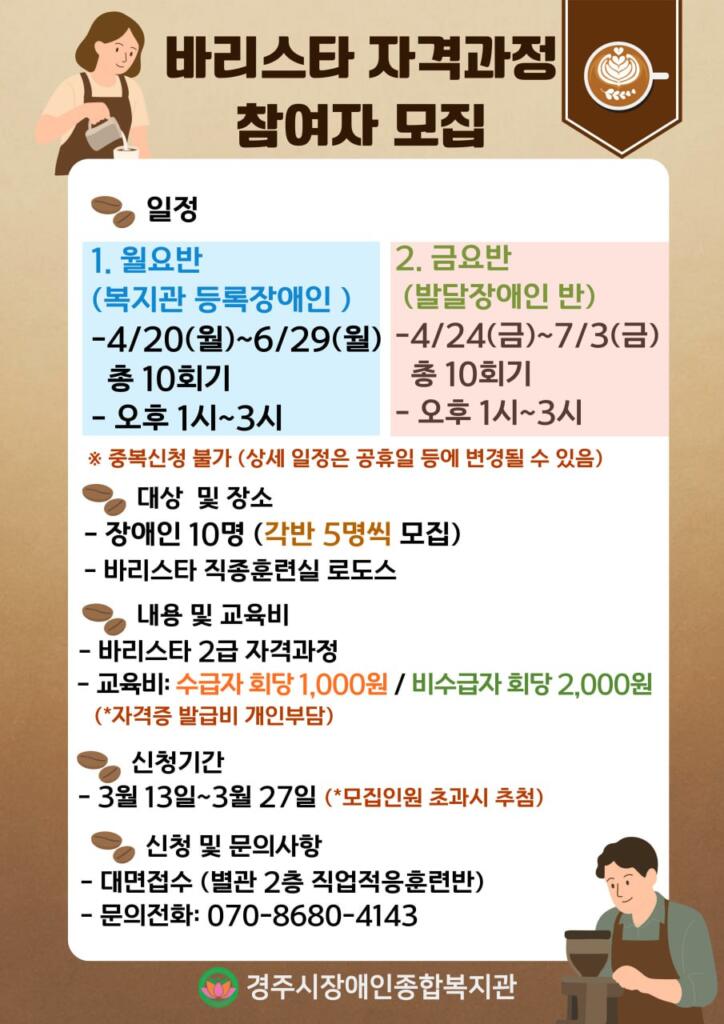 홈복지관소식공지사항공지사항 공지사항 [공지] 바리스타 자격과정 참여자 모집 작성자 Admin 작성일 2026-03-13 10:07 조회 2062 바리스타 자격과정 참여자(지역 장애인 10명) 를 아래와 같이 모집합니다 인쇄 « [공지] 경상북도인재평생교육재단 평생교육 특성화 지원사업 '우리 함께 다(多) 스마일' 건강요리, 아로마 향기치료 참여자 모집 [공지] 2026년 경주시평생학습도시운영사업 참여자 모집 » 목록보기 답글쓰기 Powered by KBoard