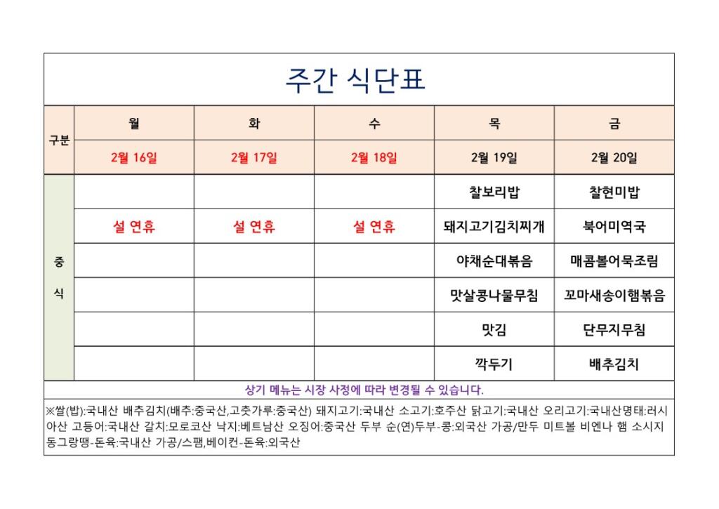 홈복지관소식공지사항복지관소식식단표 식단표 [식단표] 2026년 2월 16일~20일 작성자 Admin 작성일 2026-02-13 13:20 조회 400 좋아요 0 싫어요 0 인쇄 « [식단표] 2026년 2월 9일~2월13일 [식단표] 2026년 2월 23일~27일 » 목록보기 답글쓰기 Powered by KBoard