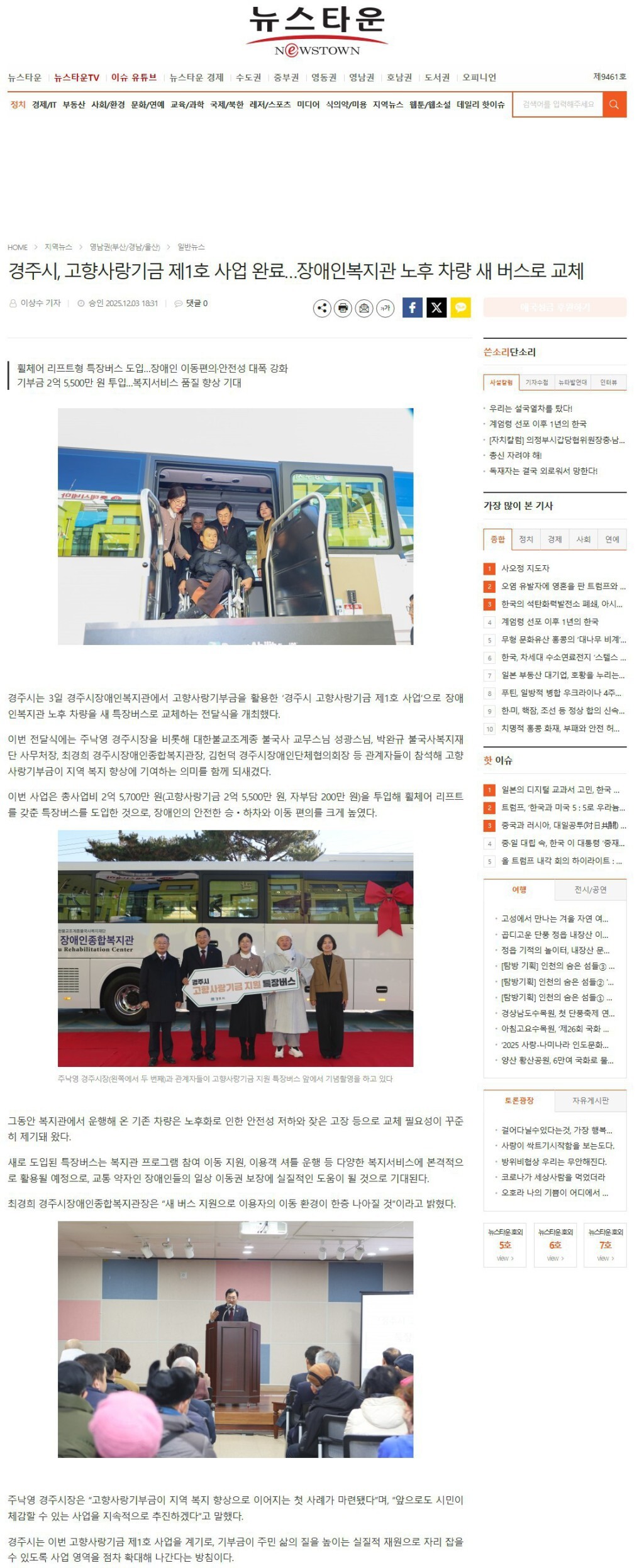 홈복지관소식복지관이야기언론속복지관 언론속복지관 [뉴스타운] 경주시, 고향사랑기금 제1호 사업 완료…장애인복지관 노후 차량 새 버스로 교체 작성자 관리자 작성일 2025-12-04 05:51 조회 45 좋아요 0 싫어요 0 인쇄 « [울산제일일보] 경주시, ‘고향사랑기금 1호 사업’ 장애인복지관 노후버스 교체 [글로벌경제신문] 경주시, 고향사랑기금 제1호사업 장애인복지관 노후차량 교체 » 목록보기 답글쓰기 Powered by KBoard
