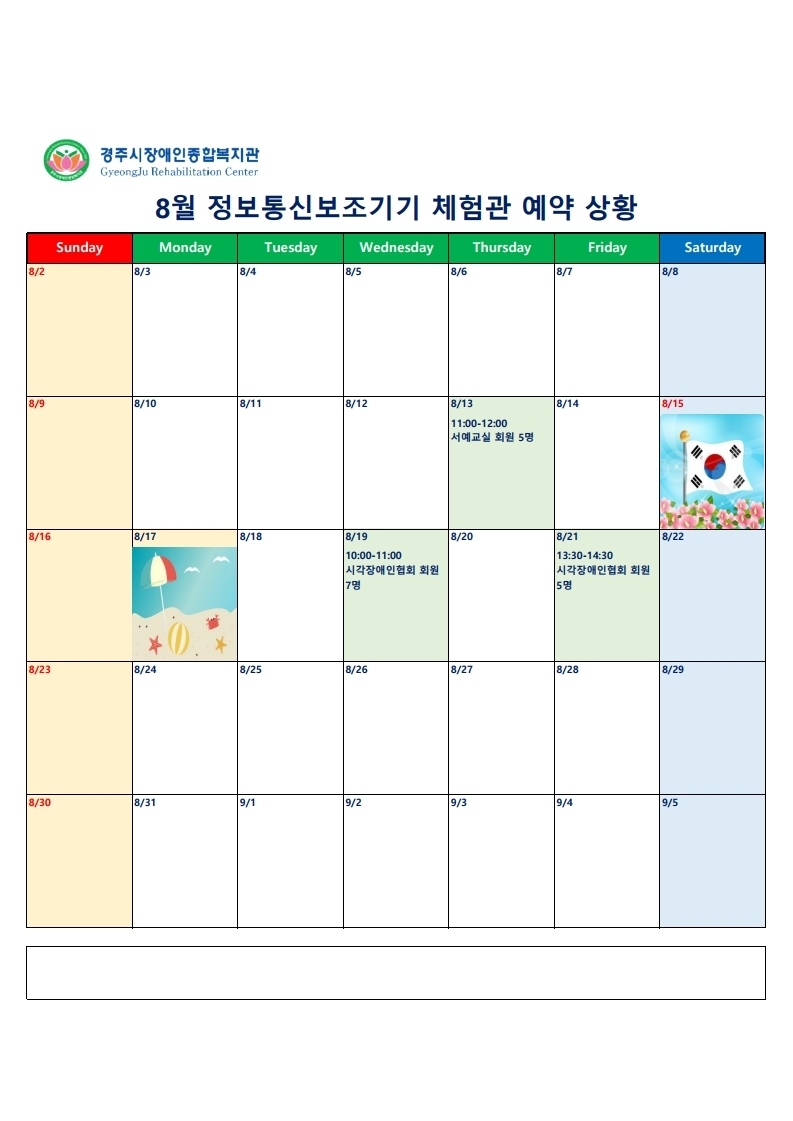 홈사업소개정보통신보조기기(ICT생활)체험관 정보통신보조기기(ICT생활)체험관 정보통신보조기기 체험관 예약 현황 작성자 관리자 작성일 2020-08-12 08:44 조회 1046 좋아요 0 싫어요 0 인쇄 « (신규사업소개) 정보통신보조기기(ICT생활) 체험관 안내 목록보기 답글쓰기 글수정 글삭제 Powered by KBoard