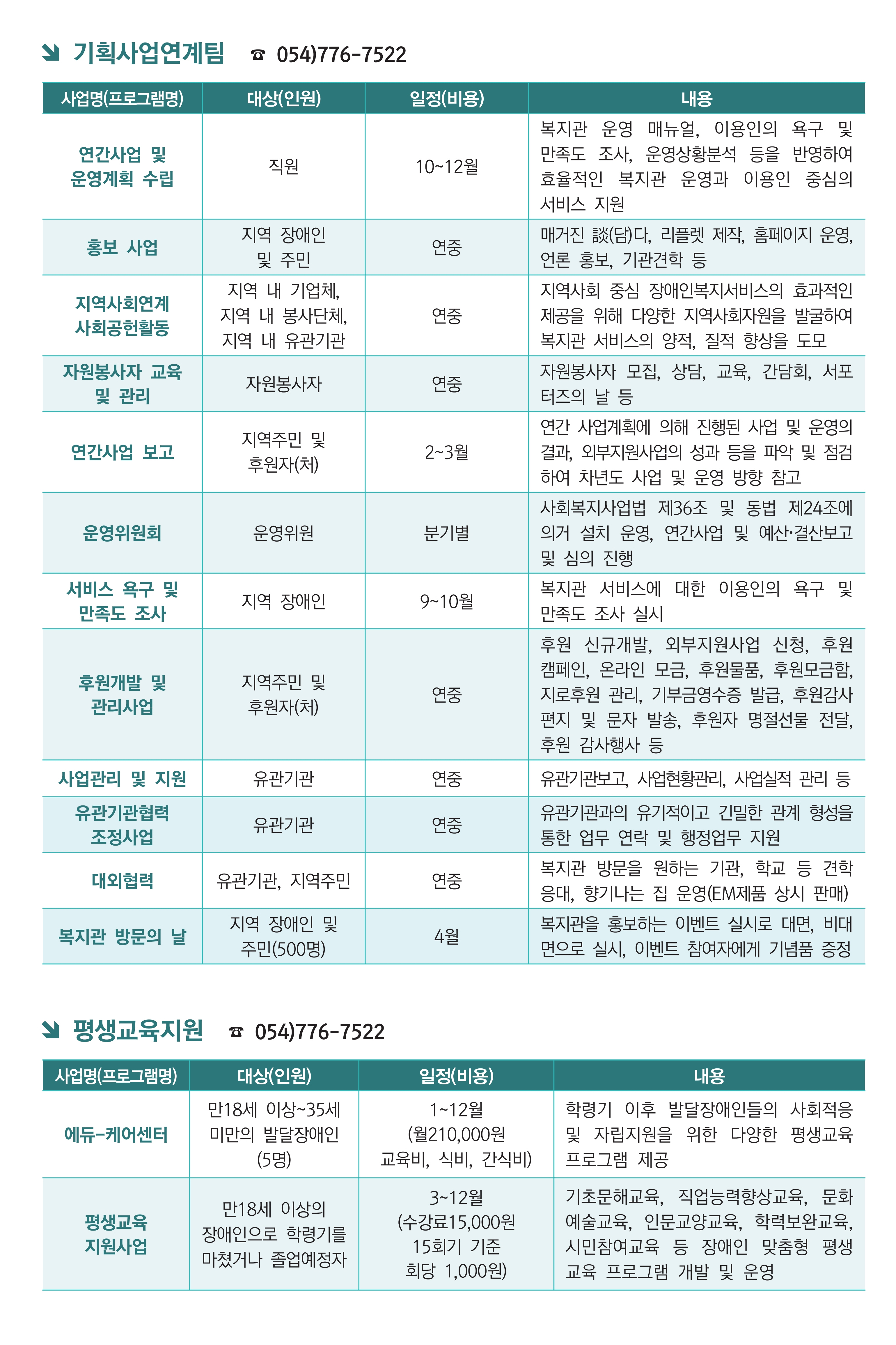 홈사업소개기획자원팀 기획자원팀 경주시장애인종합복지관 기획자원팀 서비스이용절차 상담예약 054)776-7522 서비스대상: 지역 장애인 및 주민 접수방법: 전화 상담이나 방문을 통한 예약접수 상담: 월~금 10:00-17:00 세부 프로그램의 일정은 변동 될 수 있습니다.