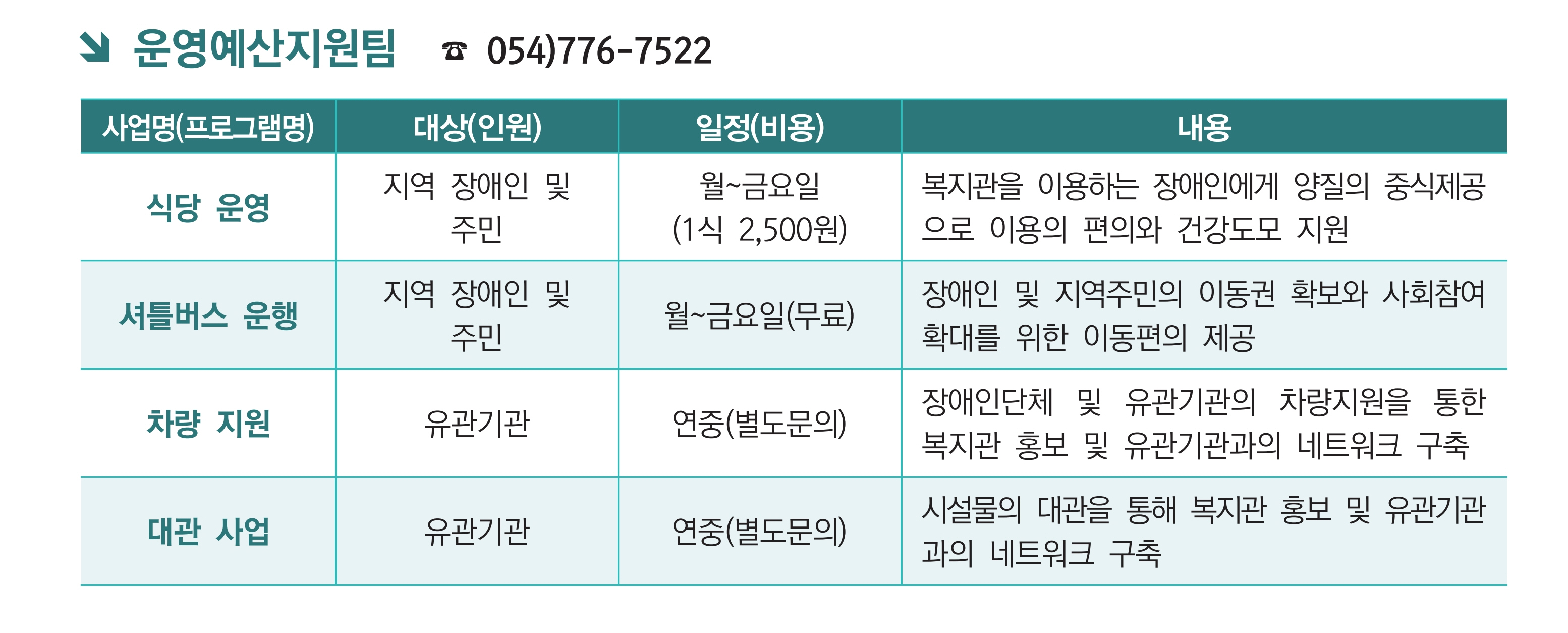 홈사업소개운영지원팀 운영지원팀 경주시장애인종합복지관 운영지원팀 서비스이용절차 상담예약 054)776-7522 서비스대상: 지역 장애인 및 주민 접수방법: 전화 상담이나 방문을 통한 예약접수 상담: 월~금 10:00-17:00 세부 프로그램의 일정은 변동 될 수 있습니다.