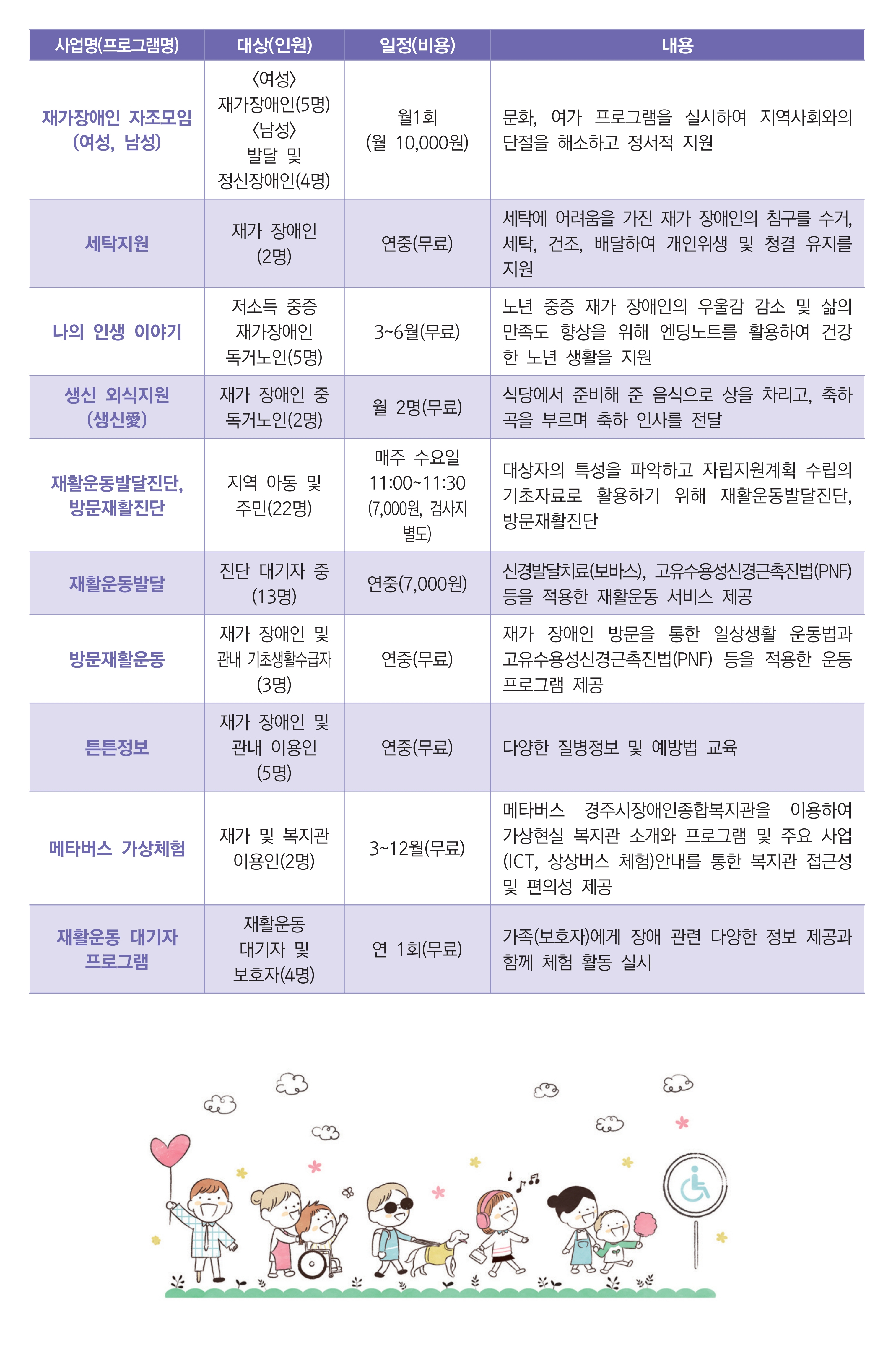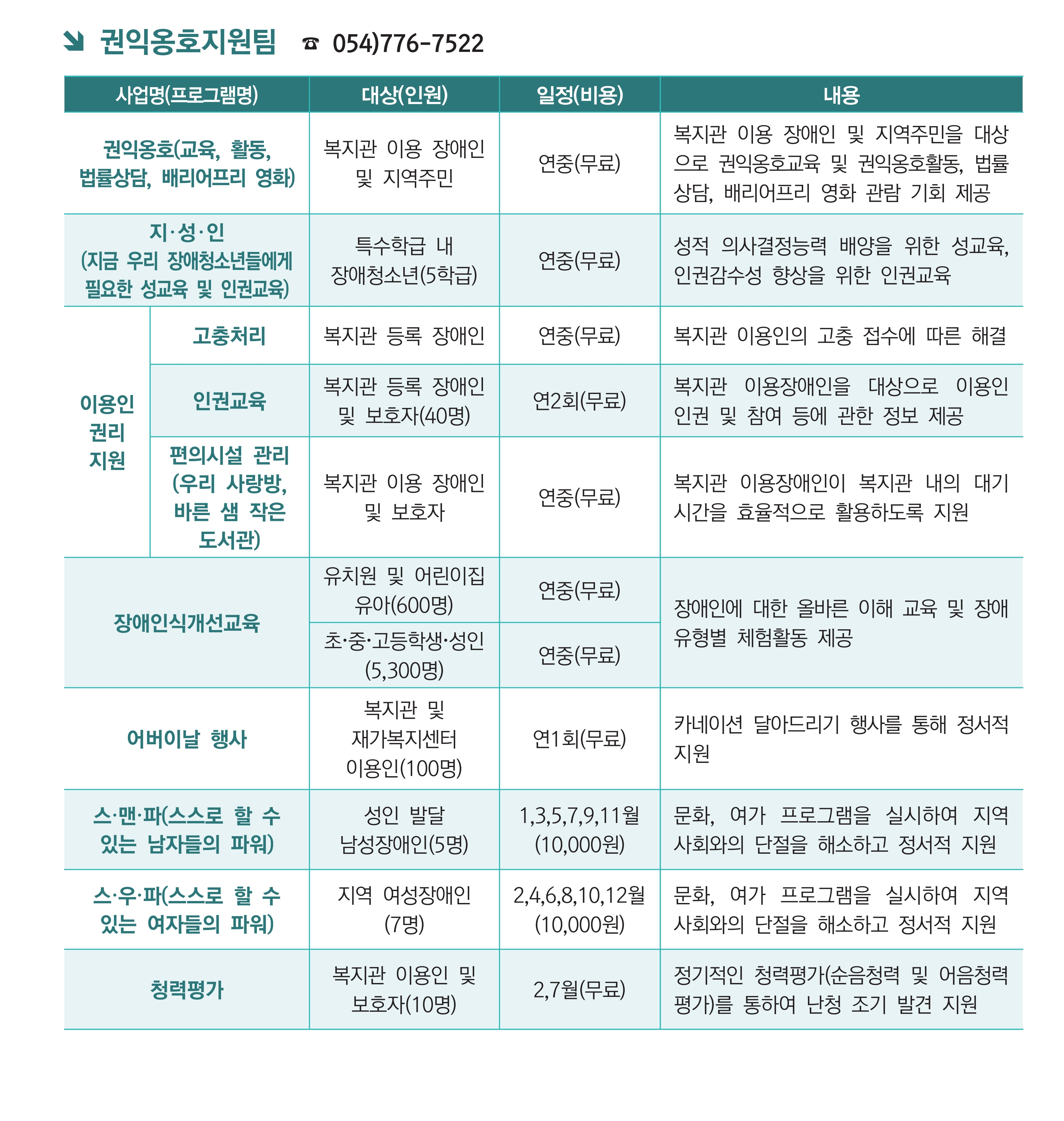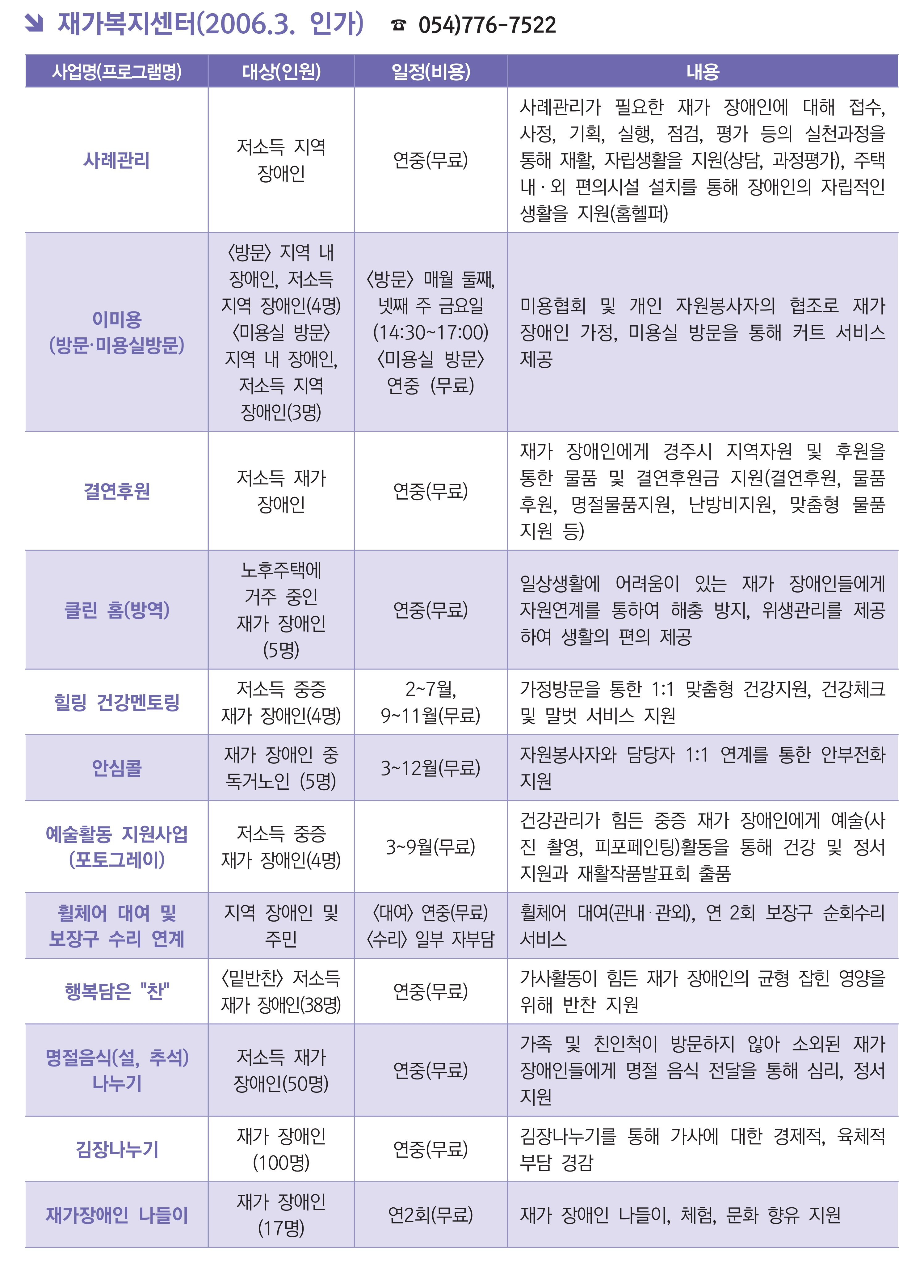 홈사업소개지역사회개발팀 지역사회개발팀 경주시장애인종합복지관 지역사회개발팀 서비스이용절차 상담예약 054)776-7522 서비스대상: 지역 장애인 및 주민 접수방법: 전화 상담이나 방문을 통한 예약접수 상담: 월~금 10:00-17:00 세부 프로그램의 일정은 변동 될 수 있습니다.